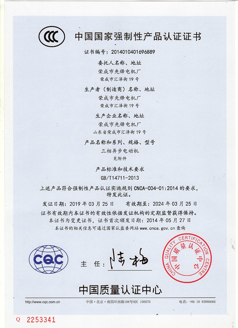 我單位于2002年就在行業(yè)內(nèi)率先通過了電動機系列產(chǎn)品的國家CQC安全認證,歷經(jīng)了2008年1月4日,2014年5月27日等多次依據(jù)國標要求提升產(chǎn)品標準更換證書,穩(wěn)步提升產(chǎn)品性能以來,2019年3月25日我們再一次順利完成了YE2系列電機CQC證書的到期更換工作,新的備案檢查準備工作正在緊張進行。。。。。。